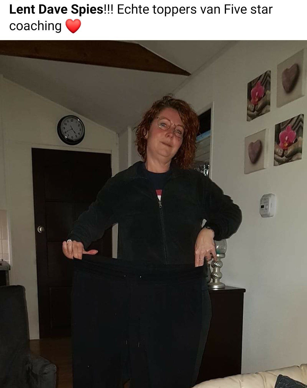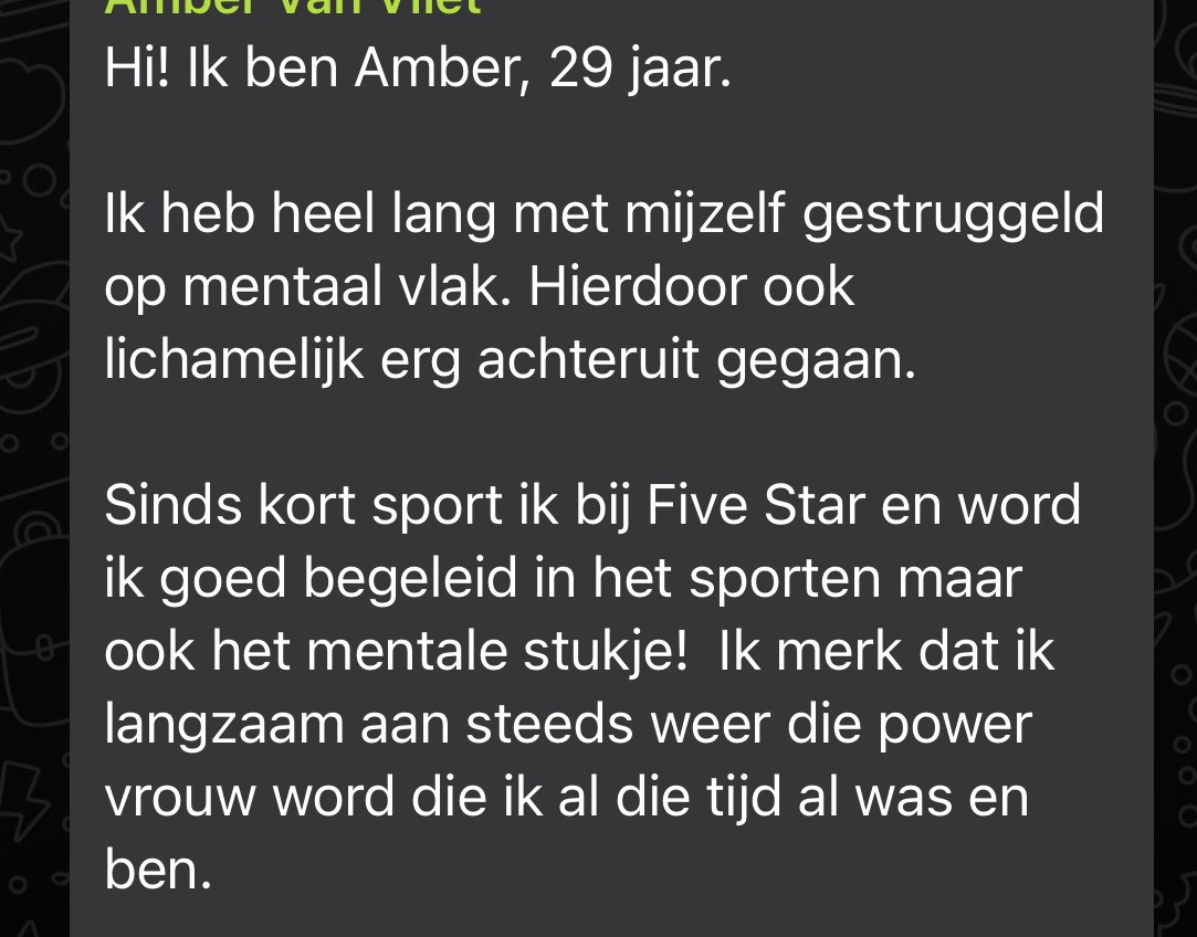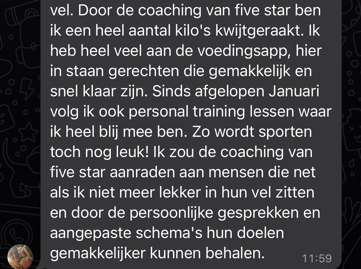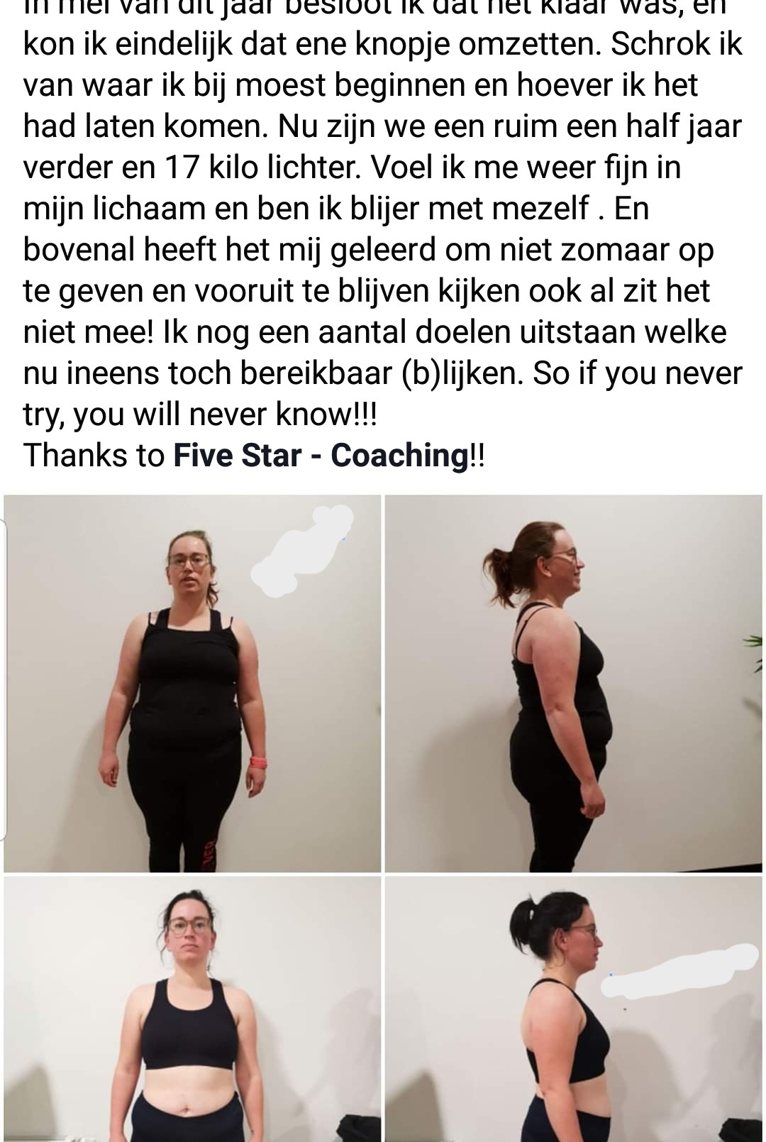 “zelf heb ik lang gedacht dat ik gewoon zo was en het maar moest accepteren, tot de eerste Corona golf waarbij ik het anders wou aanpakken.. Door aan te melden bij FiveStarCoaching ben ik begonnen met super veel te leren over voeding en iedere week een Personal training ging ik sporten voortaan leuk vinden.