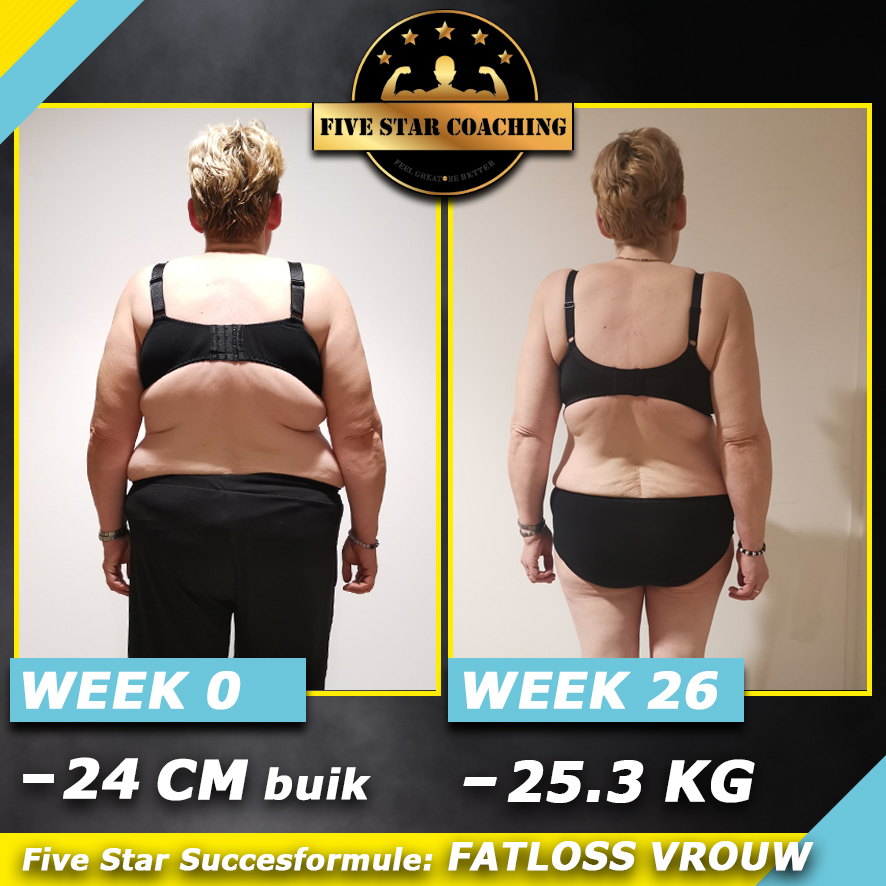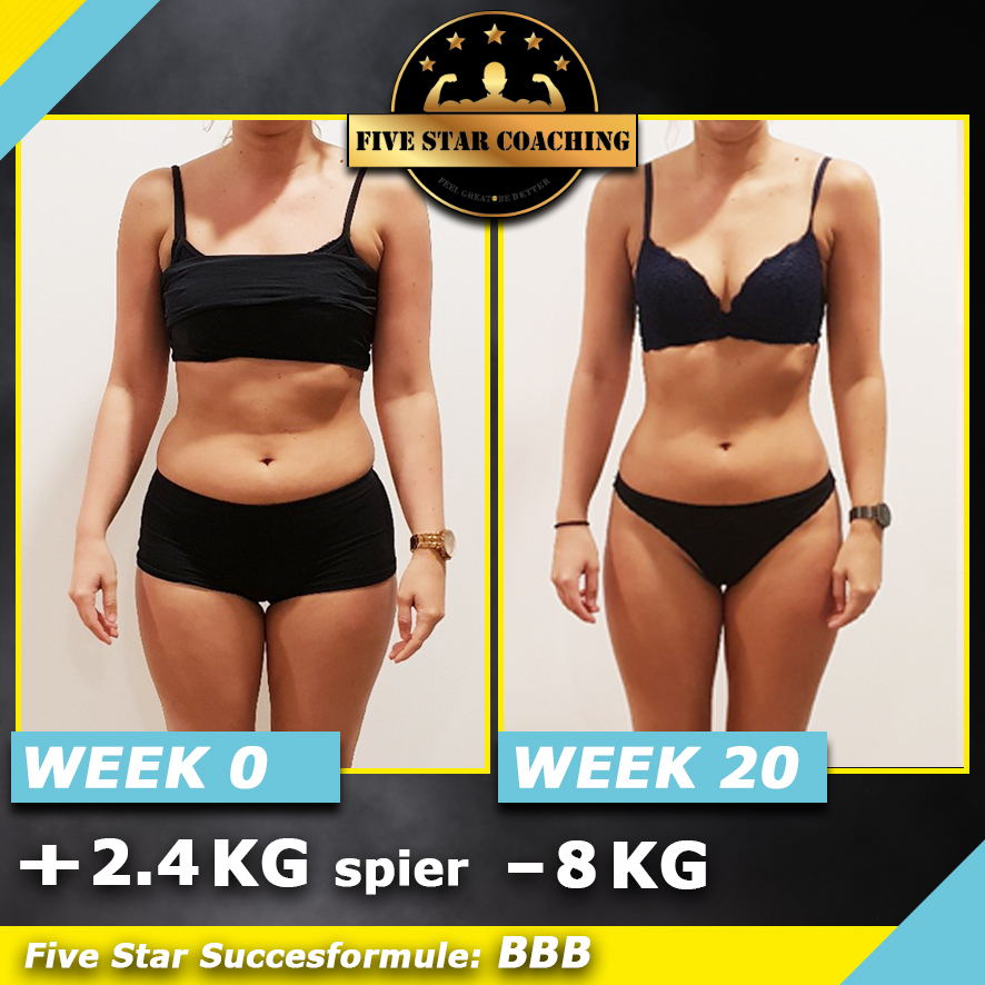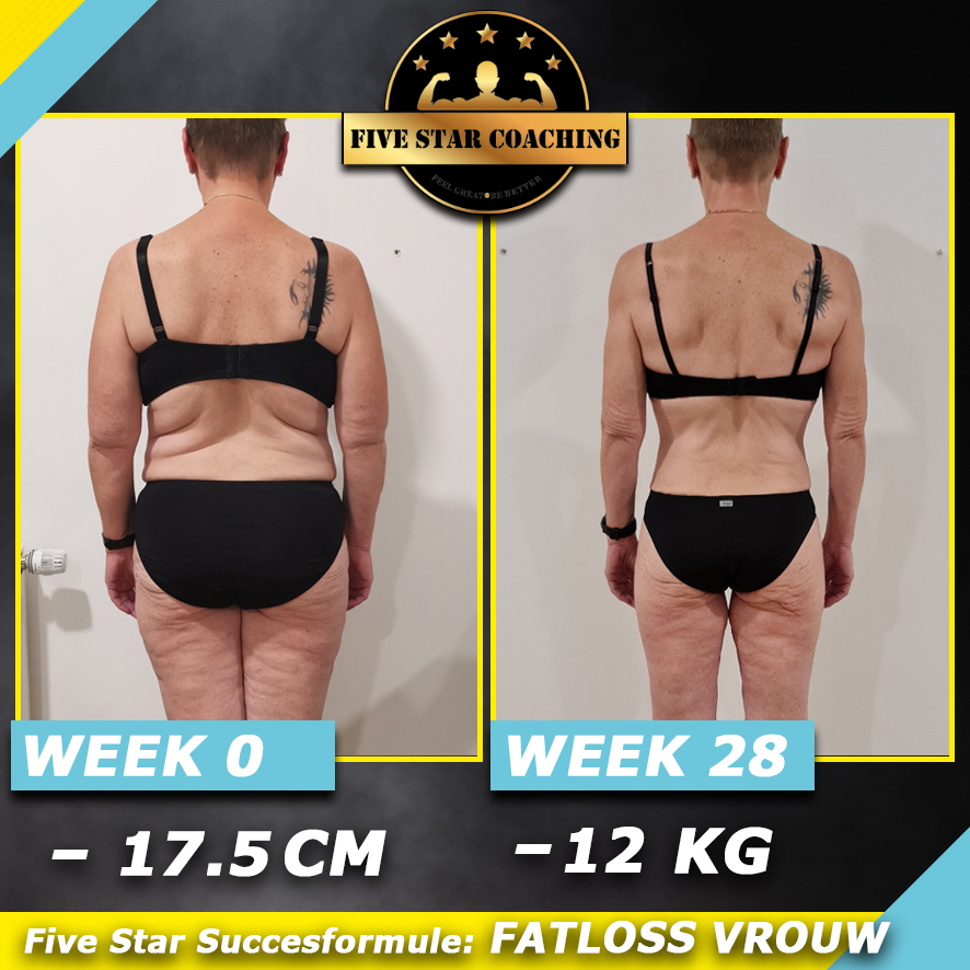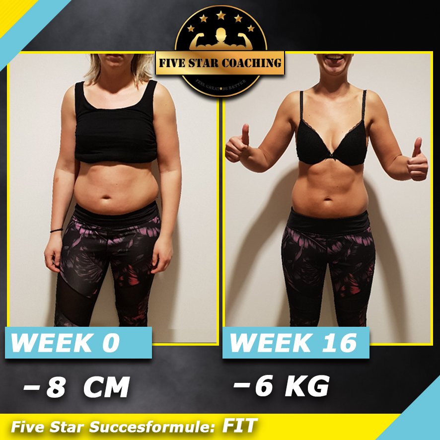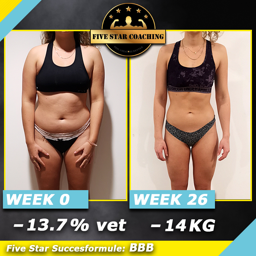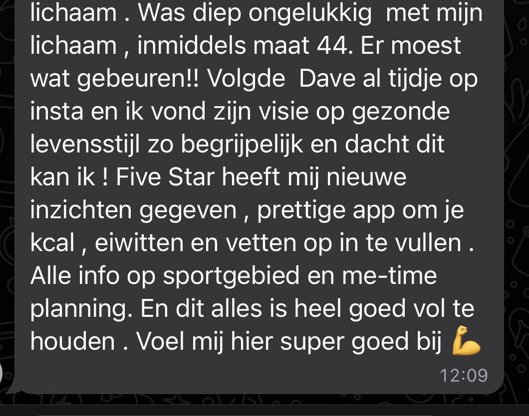 “zelf heb ik lang gedacht dat ik gewoon zo was en het maar moest accepteren, tot de eerste Corona golf waarbij ik het anders wou aanpakken.. Door aan te melden bij FiveStarCoaching ben ik begonnen met super veel te leren over voeding en iedere week een Personal training ging ik sporten voortaan leuk vinden.