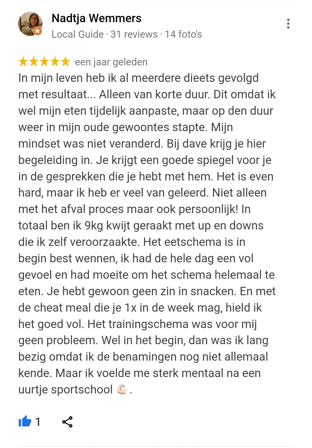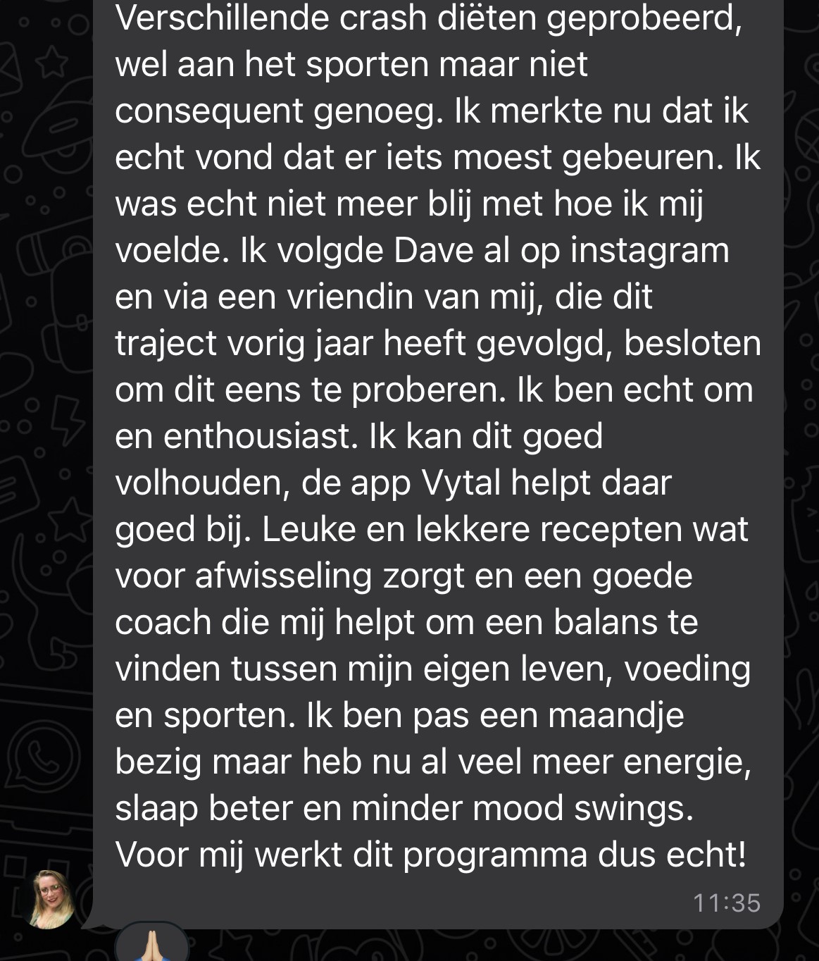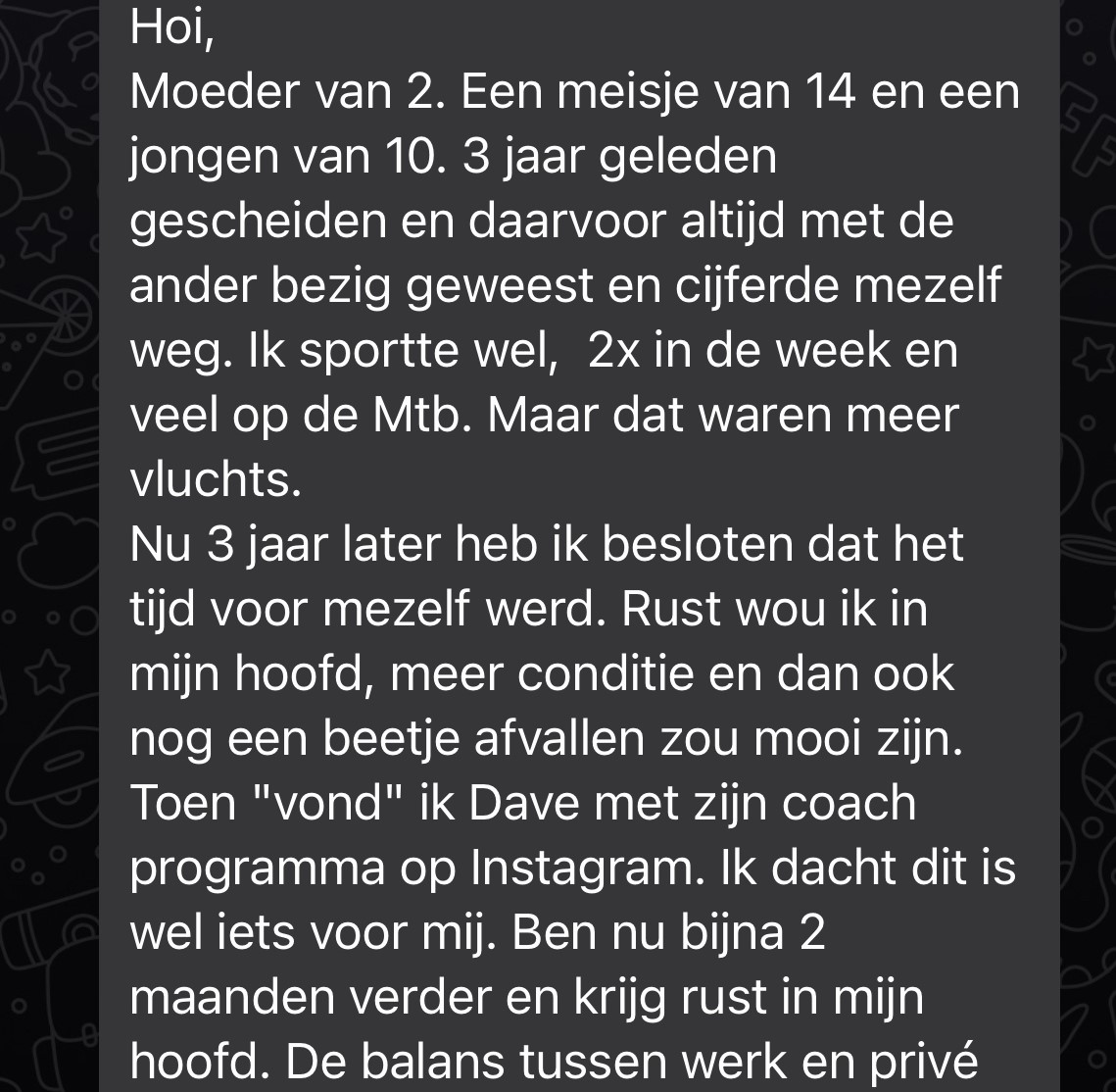 Zo gingen we aan de slag waarbij de laatste week intensief gecoacht werd door Dave himself! Ik ben erg trots op het eind resultaat en had nooit verwacht dat zoiets überhaupt mogelijk zou zijn. Nu het komende jaar blijf ik onder de coaching om een goede balans te vinden!